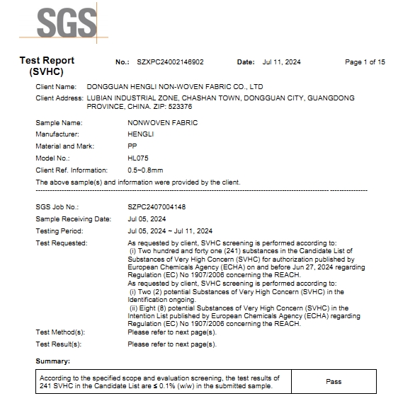 • 無紡布2024年SGS環保測試報告 注:測試結論依賴于對高關注物質如硼、鉻、砷等元素含量的檢測。 ...